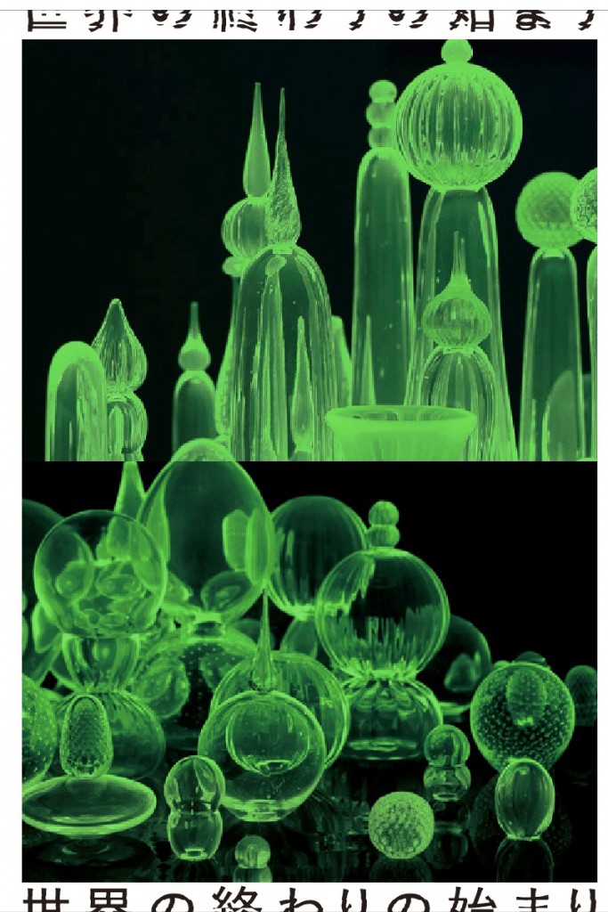 強い光の中にいると、影の存在をしばしば忘れてしまう。高度経済成長からバブルへと向かった60~80年代は、人々が夢見た「科学がもたらす明るい未来」を享受しながらも、それが落とす影がじわじわと存在感を増した時代ではなかっただろうか。「宇宙戦艦ヤマト」や「モスラ」、「鉄腕アトム」などの世界観を参照しながら、松藤は「世界の終わりの始まり」のイメージを提示する。新陳代謝を繰り返しながら拡大、増殖を続ける都市は、それ自体が生命体のメタファーである。危険な光を内包するウランガラスの都市は、禍々しくも美しく、見る者を魅了する。生と死、破壊と再生、繰り返される終わりと始まりの物語と、我々が手にしたものの対価という濃い影を背後にまとって。