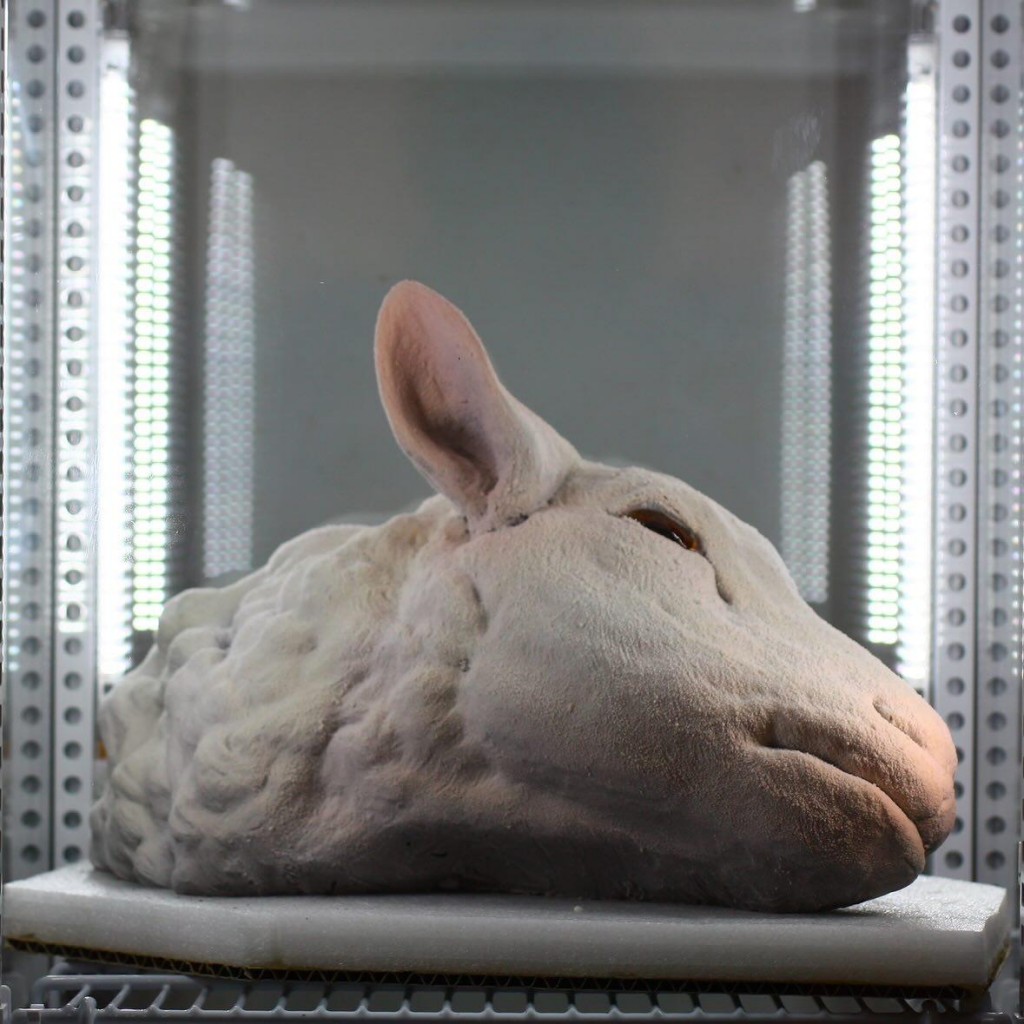 In A Circled View, a chocolate sculpture of a sheep’s head is displayed inside a refrigerator — a device of preservation and isolation.